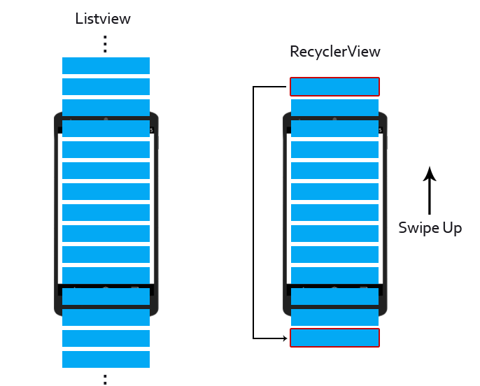 Recycler 재활용이 되는 ViewGroup이라고 생각하면 된다. 그림으로 보면 일반 리스트뷰와 크게 차이를 느낄 것이다.